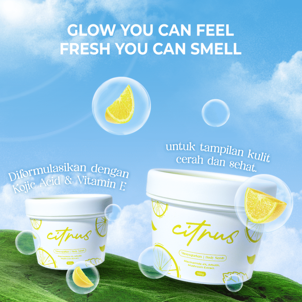 Body scrub dengan wangi Citrus yang diformulasikan secara eksklusif untuk MENCERAHKAN & mengangkat sel kulit mati. Diperkaya dengan kandungan Niacinamide, Arbutin, Glutathione, Grape Seed Extract, dan Kojic Acid yang dapat mencerahkan kulit secara merata. Dilengkapi dengan perpaduan Mushroom Extract dan Jojoba Oil yang menjaga kelembapan dan hidrasi kulit serta Vitamin E yang menutrisi kulit. Untuk kulit tampak cerah, terasa halus, lembut, dan wangi.Dengan Aroma Citrus yang segar & kuat dapat menghilangkan bau badan pada kulit tubuh