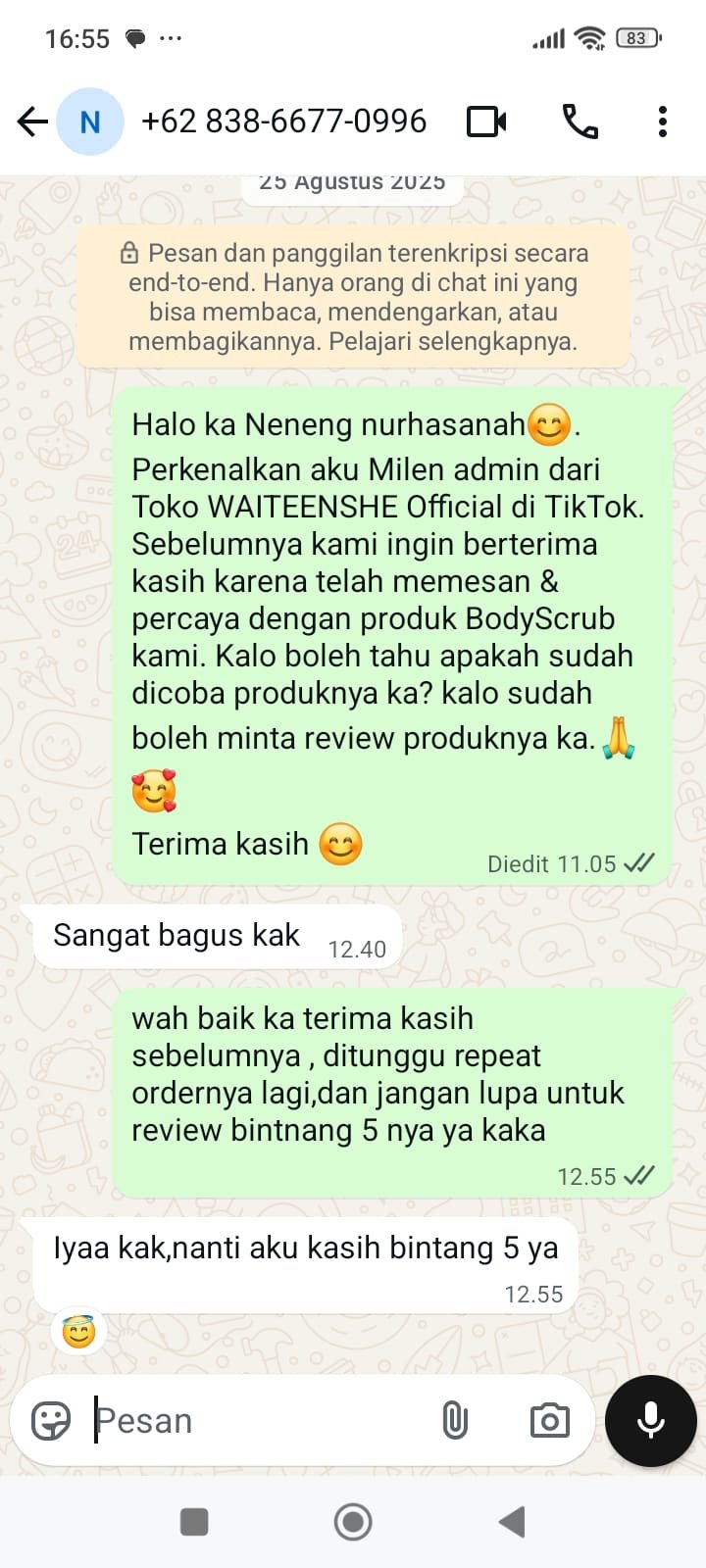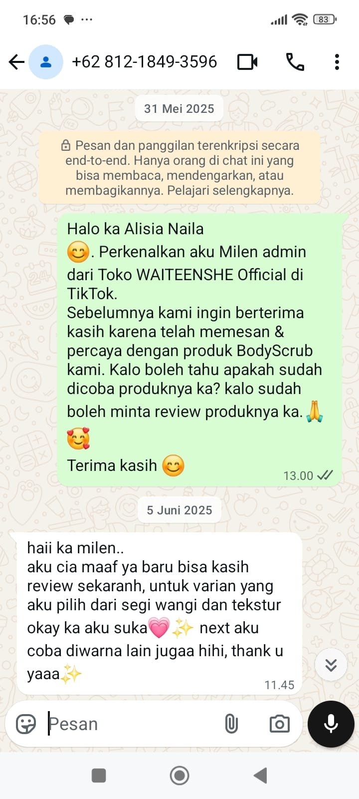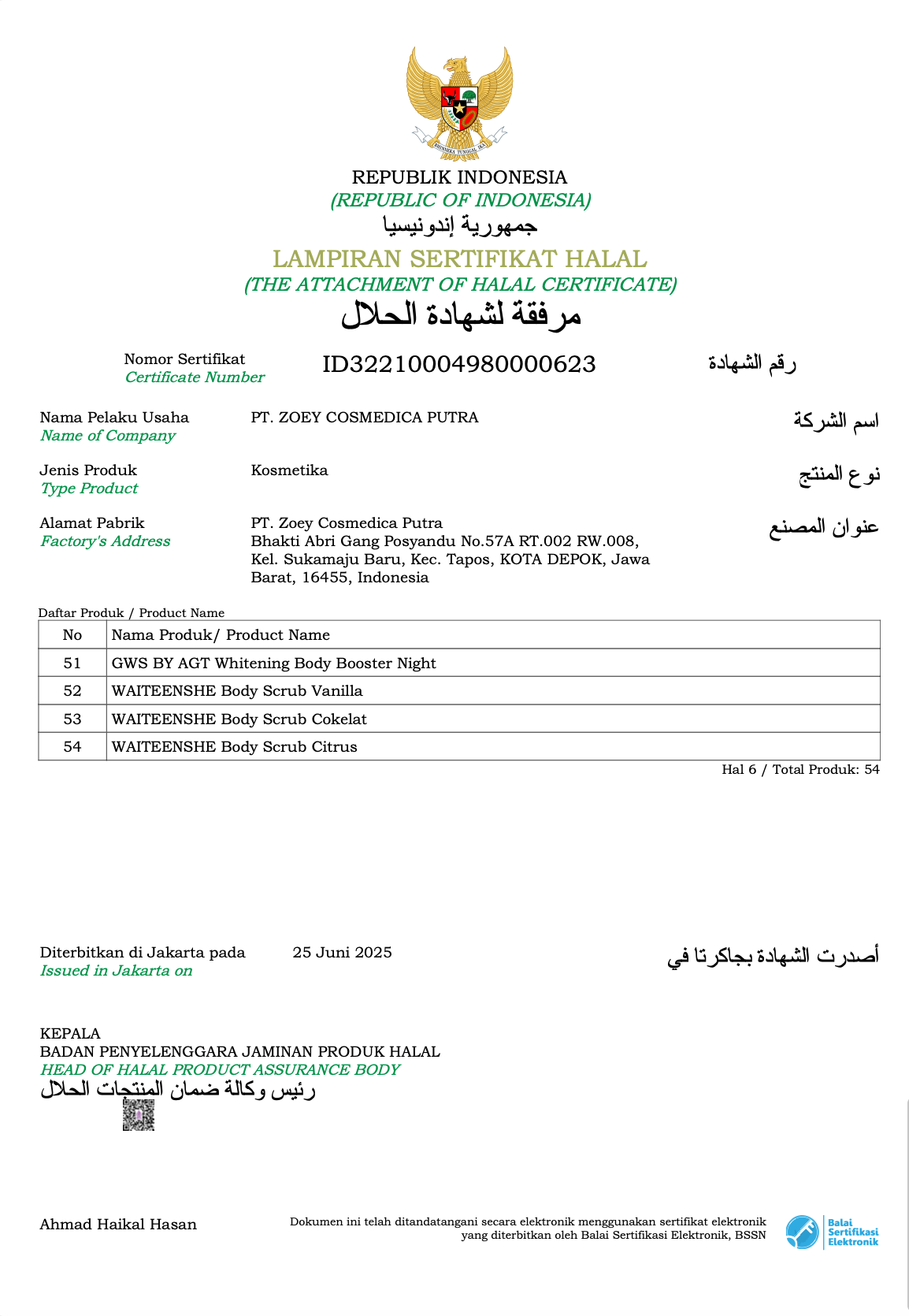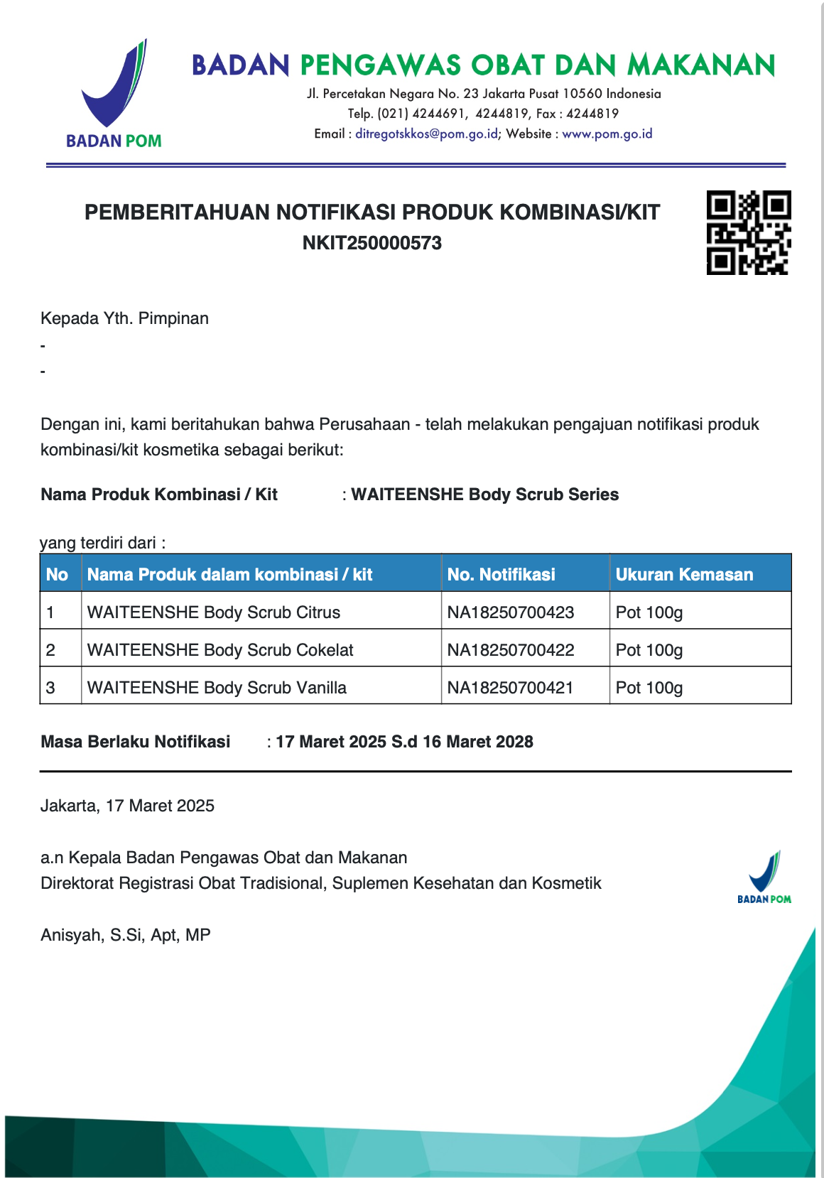 Semua Produk dari WAITEENSHE Telah Terdaftar di BPOM RI & HALAL MUI. WAITEENSHE Body Scrub juga BISA dipakai Wanita & Pria, serta AMAN untuk Ibu Hamil & Menyusui.