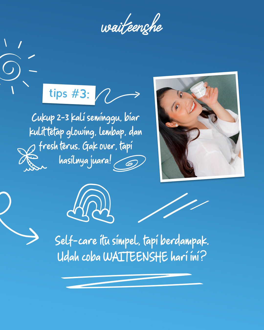 Tidak seperti Body Scrub pada umumnya yang harus dibilas, tekstur dari WAITEENSHE dibuat lembut & tidak lengket sehingga bisa untuk pemakaian Tanpa Bilas untuk kamu yg dalam kesibukan aktifitas