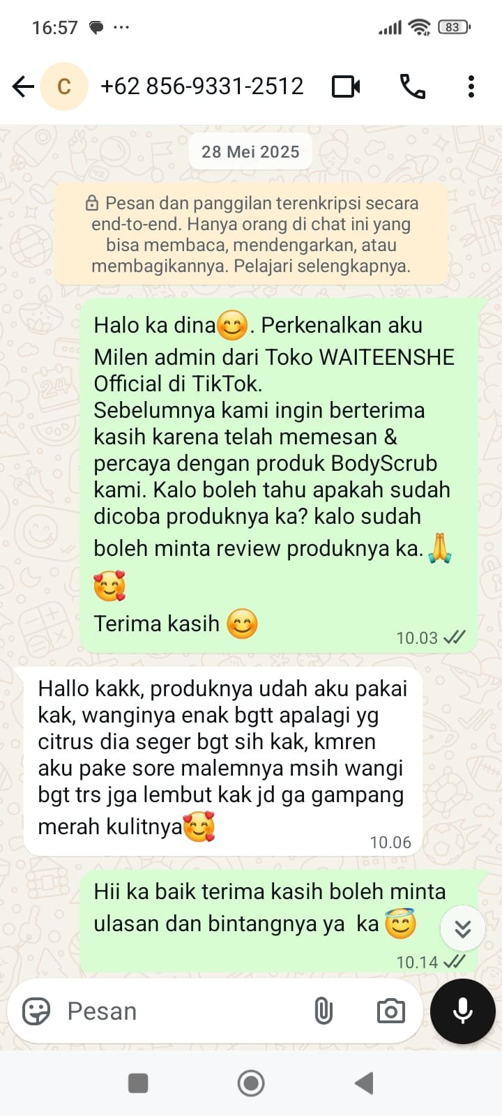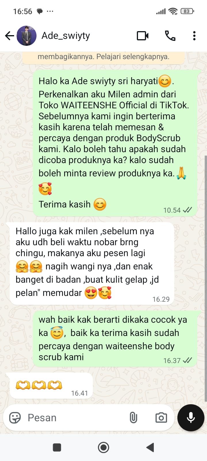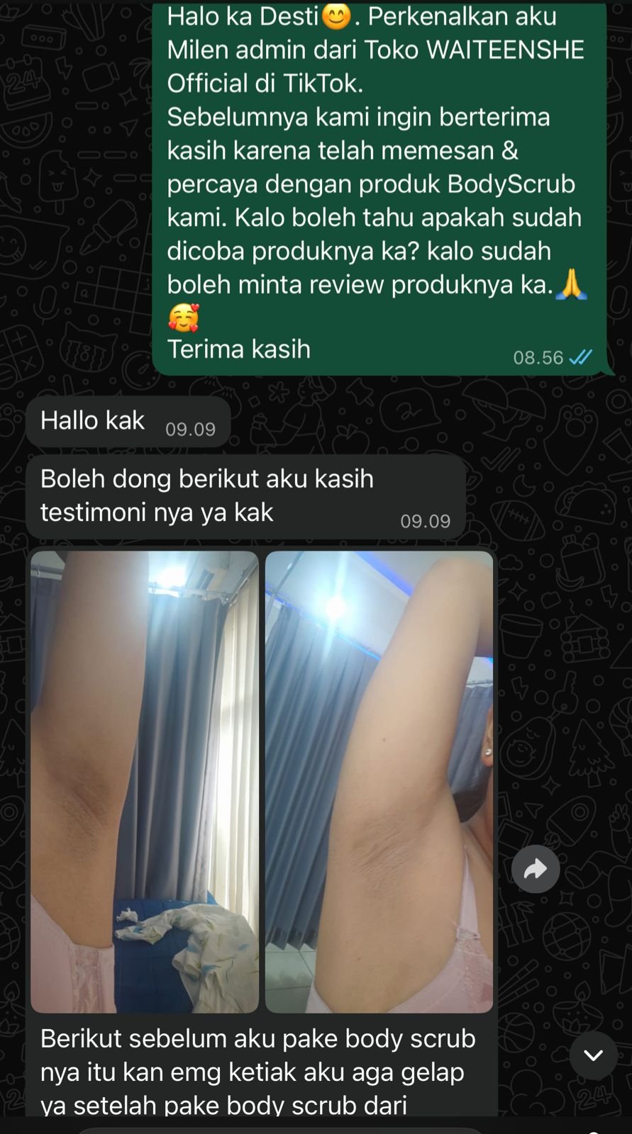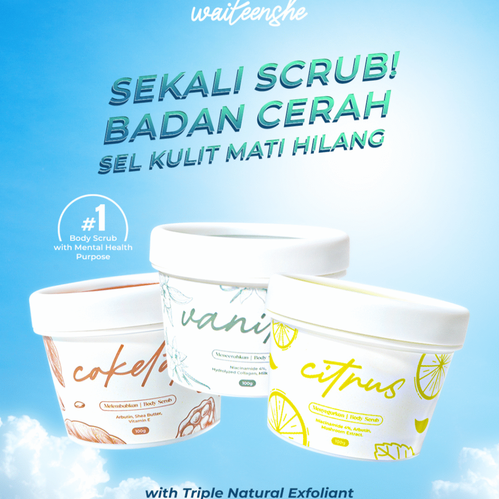 WAITEENSHE Body Scrub adalah Body Scrub kekinian yang diformulasikan khusus untuk MENCERAHKAN kulit tubuh, MELEMBABKAN, MELEMBUTKAN dan menangkat sel kulit mati pada kulit tubuh.