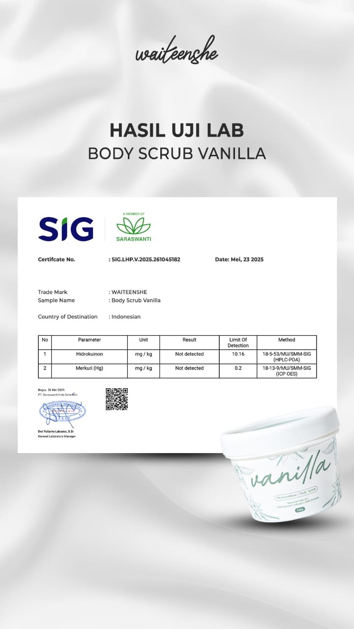 Body scrub dengan wangi khas Vanilla yang diformulasikan secara eksklusif untuk MENCERAHKAN Kulit & mengangkat sel kulit mati. Diperkaya dengan kandungan Niacinamide dan Kojic Acid yang dapat mencerahkan kulit secara merata serta Milk Extract yang merawat kulit. Dilengkapi dengan perpaduan Hydrolyzed Collagen dan Argan Oil yang menjaga kelembapan dan hidrasi kulit serta Vitamin E yang menutrisi kulit. Untuk kulit tampak cerah, terasa halus, lembut, dan wangi.