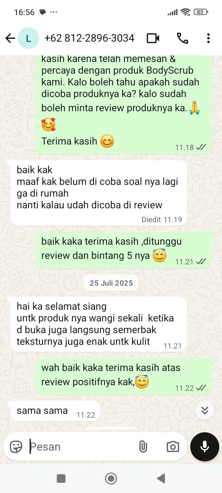 Selain Bisa Mencerahkan & Membantu merawat kulit berjerawat, WAITEENSHE Body Scrub juga bisa Kamu jadikan Pengharum kulit tubuh/ketiak karena Aroma dari Scrubnya sangat Menyegarkan, Merelaksasi & Tahan Lama.